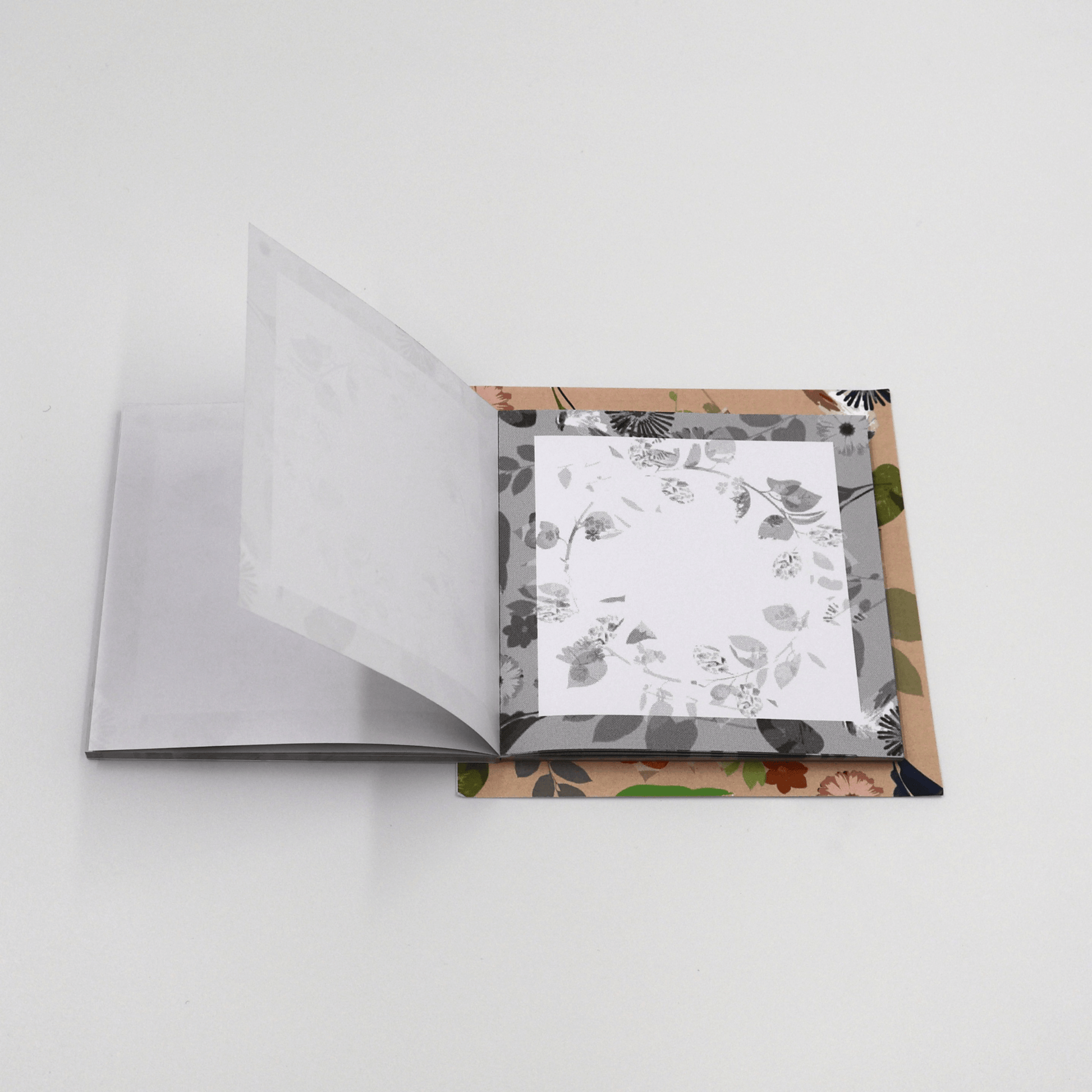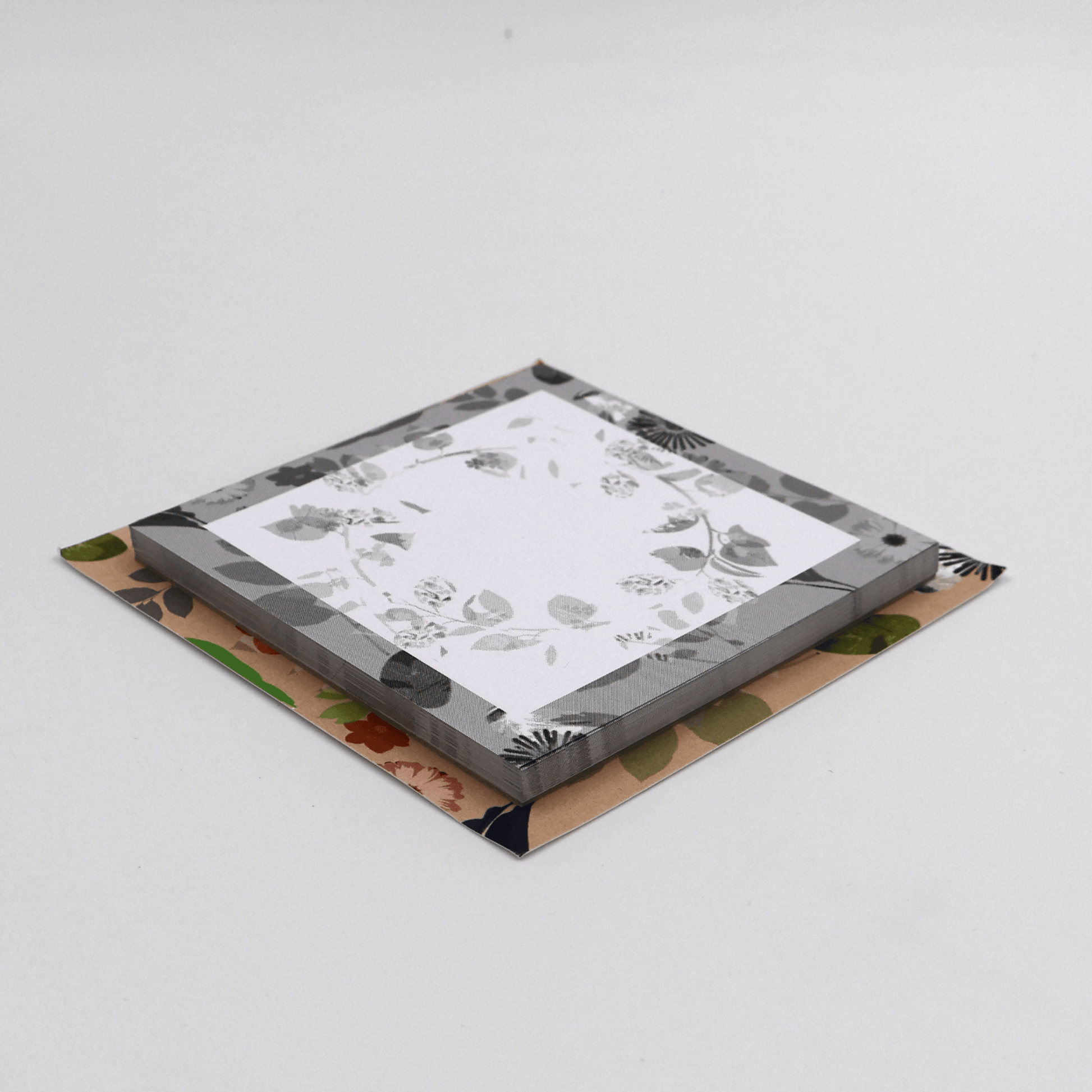 High-quality black and white printed square table notepad on a colour base, glued at the side. A total of 40 pages for jotting down notes and capturing ideas.