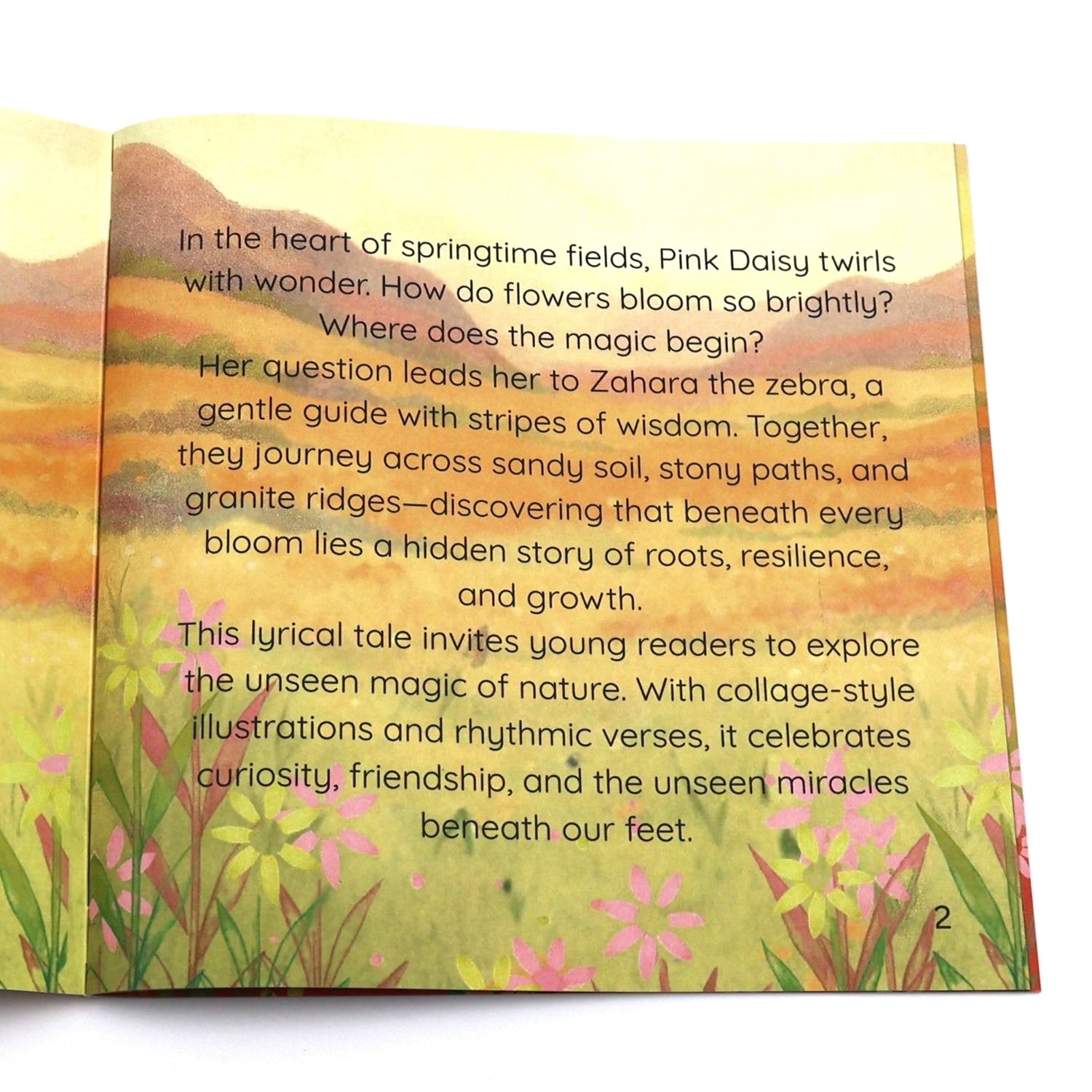 In the heart of springtime fields, Pink Daisy twirls with wonder. How do flowers bloom so brightly? Where does the magic begin? Her question leads her to Zahara the zebra, a gentle guide with stripes of wisdom. Together, they journey across sandy soil, stony paths, and granite ridges—discovering that beneath every bloom lies a hidden story of roots, resilience, and growth.