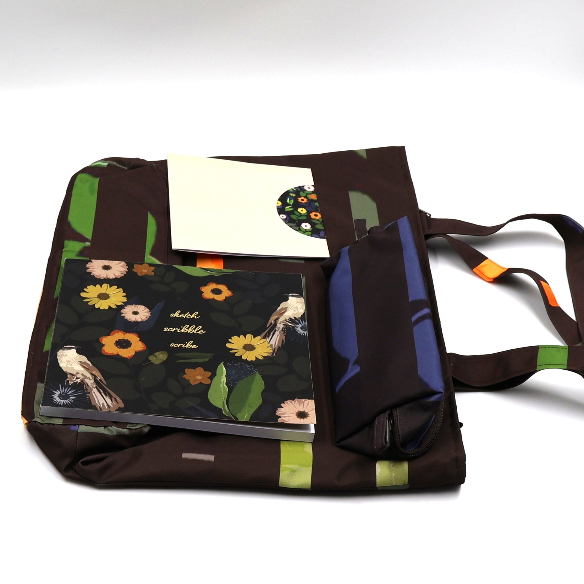 • A spacious, machine-washable Zipped Tote Bag with wildflower motifs on a bold dark background—perfect for books, notebooks, and writing essentials